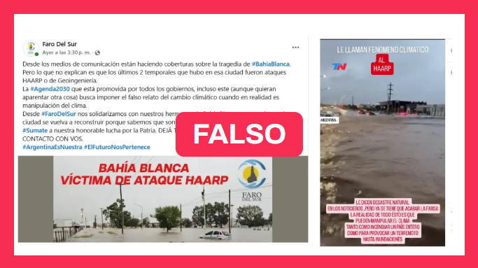 Tras el fuerte temporal que azotó el último viernes a la localidad bonaerense de Bahía Blanca, comenzaron a circular en redes sociales posteos que aseguran que las intensas lluvias fueron supuestamente provocadas por el proyecto HAARP.