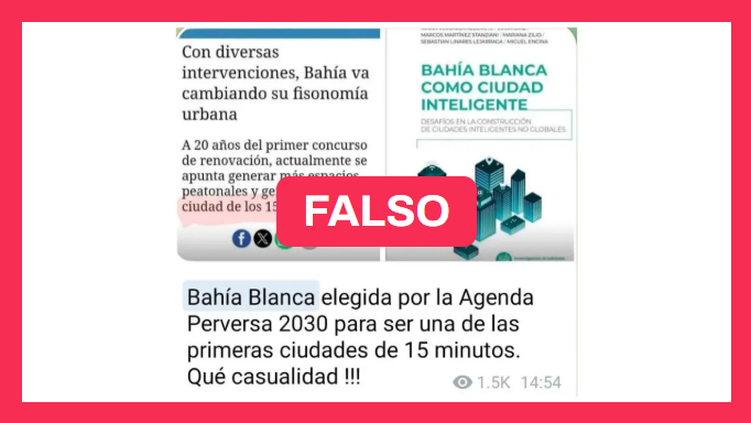 Pero esto es falso. Si bien el desarrollo de ‘ciudades de 15 minutos’ es impulsado en varias ciudades del mundo y de la Argentina, ningún plan urbanístico propuesto o implementado en Bahía Blanca plantea su destrucción para llevarse a cabo.
