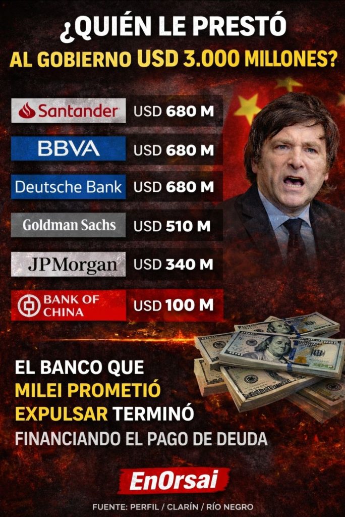 De esta manera el ministro de Economía, Luis Caputo, logró cerrar un préstamo tipo REPO por 3.000 millones de dólares para cubrir los vencimientos de enero. Desde el punto de vista técnico, la operación no sorprendió a los mercados, que ya descontaban algún tipo de financiamiento de corto plazo. Lo que sí generó ruido —y expuso una contradicción política de fondo en especial para la horda fanática y rentada de Trolls en redes— fue la composición del consorcio de bancos: entre las grandes entidades occidentales apareció el Bank of China, aportando cerca de 100 millones de dólares. No es un monto decisivo en términos cuantitativos, pero sí lo es en términos simbólicos y estratégicos. China se sentó a la mesa justo cuando el Gobierno argentino promete, puertas afuera, revisar y enfriar esa relación para complacer a Washington.