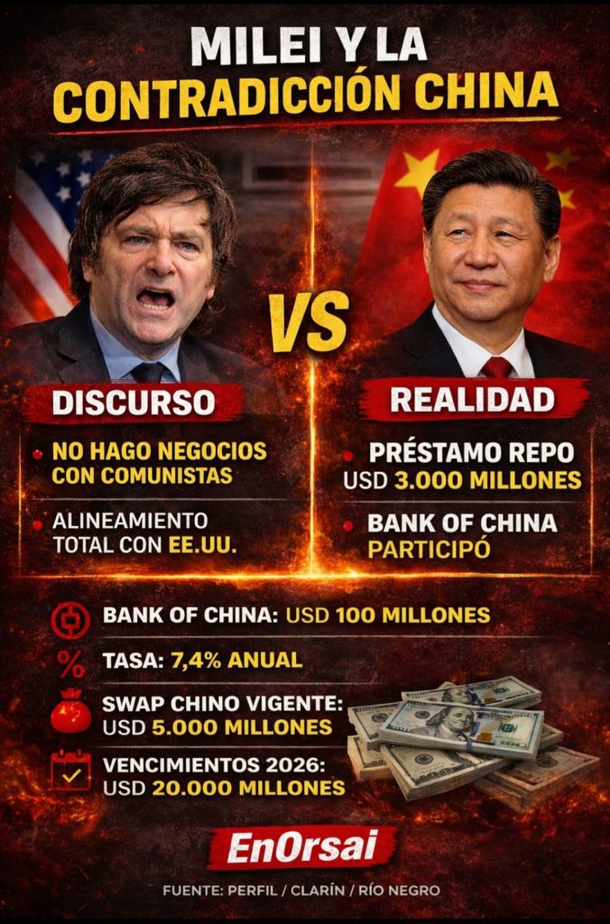 El relato libertario se sostuvo durante meses sobre una promesa tan grandilocuente como simplista: cortar la dependencia financiera, romper con China, alinearse sin matices con Estados Unidos y demostrar que el “mercado” volvería a confiar en la Argentina apenas se aplicara el ajuste correcto. Ese discurso, repetido hasta el cansancio en campaña y reforzado desde la Casa Rosada, chocó de frente con la realidad, cuando el Gobierno tuvo que admitir —aunque sin decirlo en voz alta— que necesitó dólares de un banco chino para pagar deuda y evitar un traspié mayor. La escena es tan elocuente como incómoda: el presidente que aseguró no hacer negocios con “comunistas” terminó agradeciendo, en los hechos, la participación del Bank of China en una operación clave para sostener la estabilidad financiera inmediata.