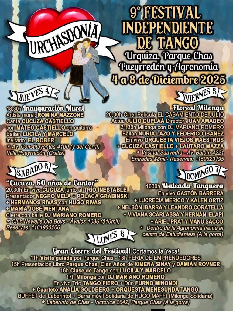 La celebración comienza a las 11hs de la mañana con la visita guiada por Magdalena Eggers por los Misterios de Parque Chas y se extiende después de la Feria con el gran cierre del 9° Festival Independiente de Tango «Urchasdonia», un encuentro que enlaza los barrios de Urquiza, Parque Chas, Villa Pueyrredón y Agronomía.