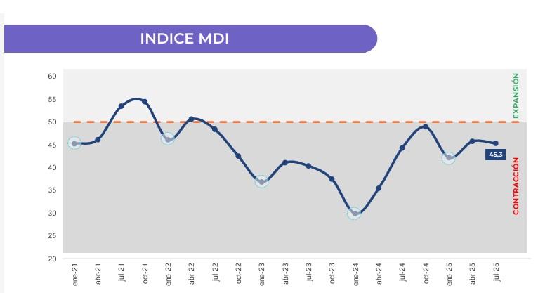 El Monitor de Desempeño Industrial (MDI) se ubicó en 45,3 puntos, por debajo del umbral de expansión por decimotercer mes consecutivo. Según el informe, “se confirma la persistencia de un escenario industrial marcado por debilidad en la demanda y un horizonte de recuperación todavía incierto”. En este contexto, el 36,3% de las empresas reportó una caída en su producción y el 43,5% en sus ventas, mientras que apenas el 18,6% indicó mejoras.