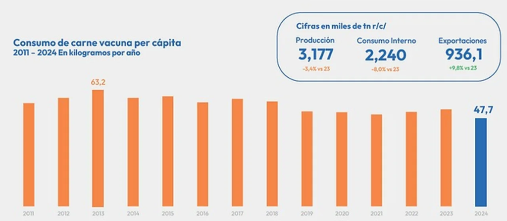 El emergente más preocupante del informe tiene que ver con la caída del consumo de carne vacuna. El 2024 fue el segundo año con más bajo consumo de este producto desde que se comenzó a registrar en 1914. Solamente en 1920 los argentinos comieron menos carne vacuna per cápita que en el primer año de la presidencia de Javier Milei. La producción cayó un 3,4% con respecto al 2023 y el consumo interno se desplomó un 8% en relación al último año del gobierno de UP. Sin embargo, la exportación de carne creció un 9,8% el año pasado. Las penas son de nosotros, las vaquitas para afuera.