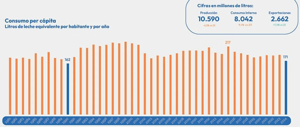 Resultado similar se registró en la leche. Mientras que las exportaciones aumentaron un 7% entre 2023 y 2024, tanto la producción como el consumo interno retrocedieron con fuerza. Hubo un 6,5% menos en cantidad de litros producidos, y un 9,1% menos de consumo de la población argentina de un producto tan esencial. Así, el 2024 fue el año de menor consumo de leche en más de tres décadas, y es necesario remontarse a 1990 para encontrar un año similar en ese indicador.