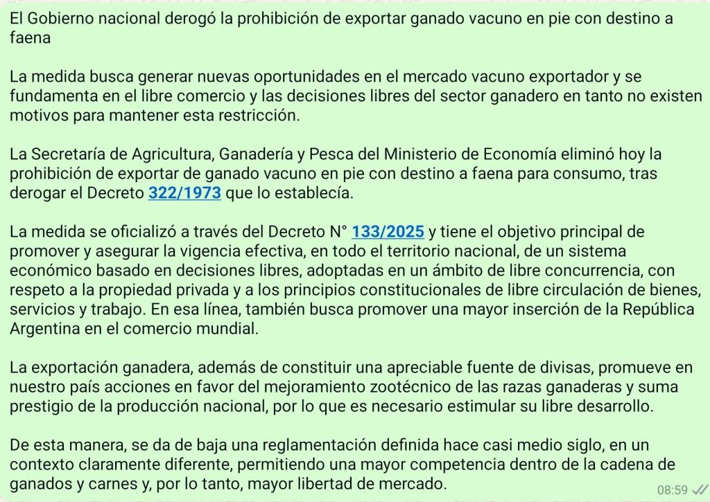 El ministro de Desregulación y Transformación del Estado, Federico Sturzenegger, defendió la decisión al señalar que la prohibición original respondía a «un problema de abastecimiento en 1973» y que su permanencia carecía de sentido en la actualidad. Según Sturzenegger, permitir la exportación de ganado en pie alineará a Argentina con prácticas comerciales internacionales, abriendo oportunidades en mercados como el asiático, donde países como Australia ya tienen una presencia consolidada.