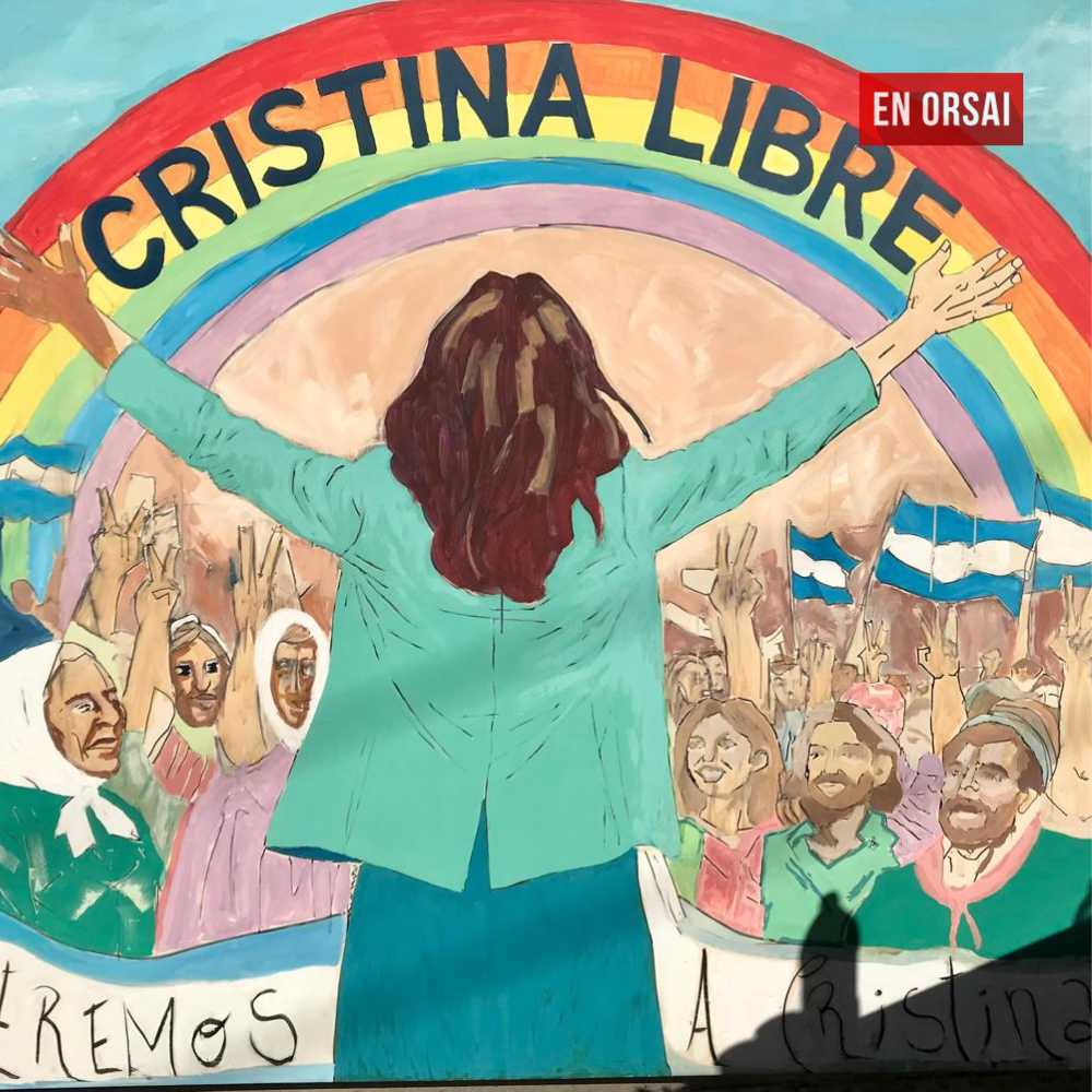 El primer mural: Muestra a Cristina de espaldas, con los brazos abiertos frente a un pueblo que celebra su libertad. En la composición conviven trabajadores y Madres de Plaza de Mayo con sus pañuelos blancos. En la base, la leyenda «Queremos a Cristina» sostiene la imagen, mientras que un arcoíris en la parte superior corona la obra con el mensaje «Cristina Libre».