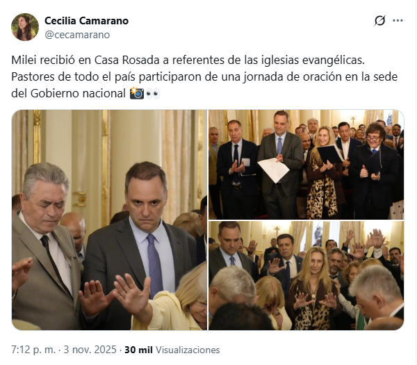 La periodista y politóloga Cecilia Camarano, acreditada en Casa Rosada y colaboradora de Ámbito Financiero, informó que Javier Milei recibió a referentes de las iglesias evangélicas en el propio salón de gobierno. Los pastores, provenientes de distintas provincias, participaron de una jornada de oración por la Nación. La escena, cuidadosamente difundida por los voceros oficiales, refuerza la imagen de un Presidente que busca respaldo espiritual mientras enfrenta el desgaste de su gestión. Pero detrás del gesto simbólico, hay una lectura política inevitable: el Estado argentino se aproxima cada vez más a un sector religioso que ha demostrado ser un actor de peso en los gobiernos de la nueva derecha latinoamericana.