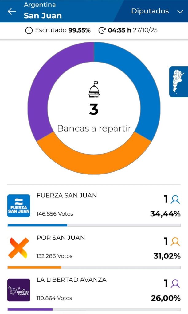 Con el escrutinio prácticamente finalizado, Fuerza San Juan se impuso con el 34,44 % y obtuvo una banca, al igual que Por San Juan (31,02 %) y La Libertad Avanza (26 %). Los resultados muestran un retroceso de la fuerza oficialista nacional y la persistencia del voto peronista en el interior.
