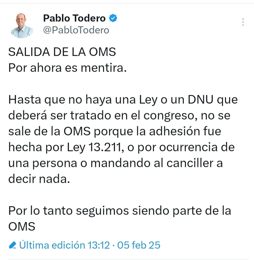 «Hasta que no haya una Ley o un DNU que deberá ser tratado en el Congreso, no se sale de la OMS porque la adhesión fue hecha por Ley 13.211, o por ocurrencia de una persona o mandando al canciller a decir nada. Por lo tanto, seguimos siendo parte de la OMS»*, escribió Todero, poniendo en evidencia que la supuesta desvinculación no tiene sustento legal.