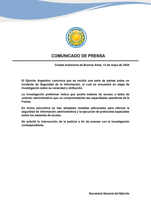 La empresa Birmingham Cyber Arms, dedicada al monitoreo de amenazas digitales en América Latina, detectó la venta de la información en foros de la dark web. En su sitio mefiltraron.com, alertaron sobre la magnitud de la filtración y advirtieron a Defensa, que para entonces aún no se había dignado a reconocer públicamente lo sucedido. La excusa formal del Ejército fue que recién el 13 de mayo emitieron el parte interno, aunque según Romero, la notificación judicial había sido realizada el 8. ¿Qué ocurrió en esos cinco días? ¿Qué se hizo, o mejor dicho, qué no se hizo?