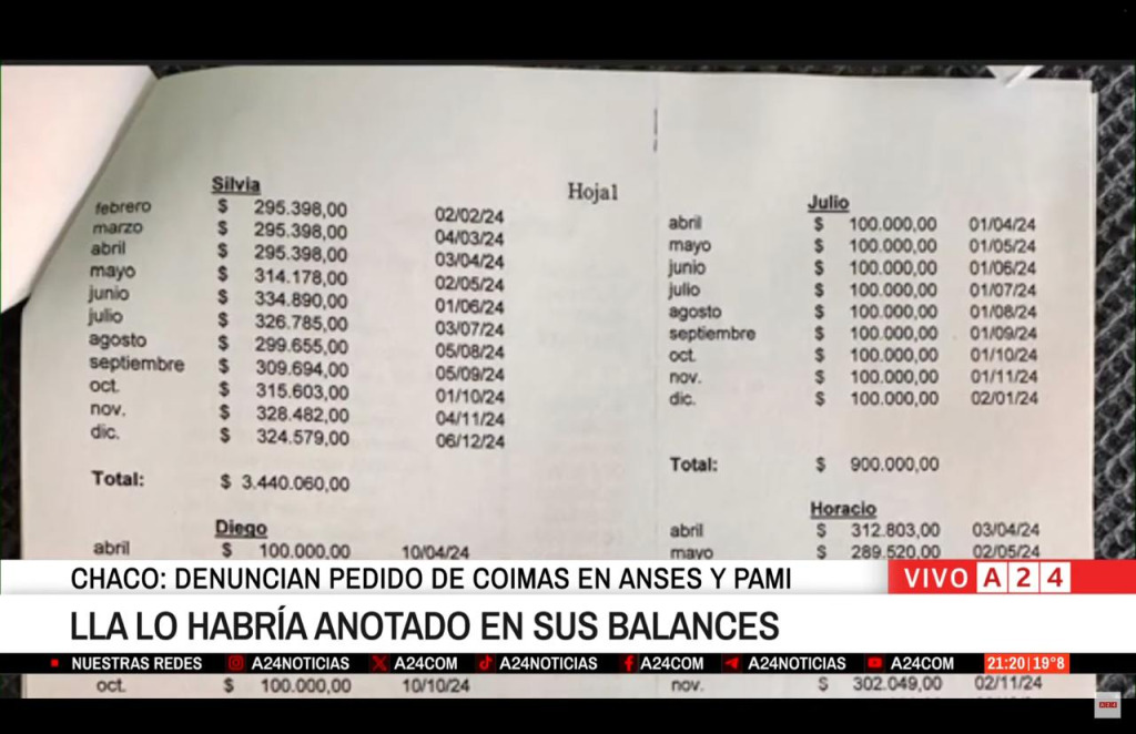 Según el informe titulado «La Libertad Avanza: Rendición desde diciembre 2023 hasta el 13 de diciembre de 2024», se habrían detectado presuntos desvíos de fondos en ANSES y PAMI, donde se solicitaba a los empleados un porcentaje de sus sueldos a cambio de mantener sus puestos. Este documento, que ya ha sido presentado ante la justicia, incluye los balances de estos aportes presuntamente recaudados de manera sistemática para financiar actividades políticas. Parte de este dinero también se habría destinado a pagar a periodistas como Alberto Medina Méndez, entre otros.