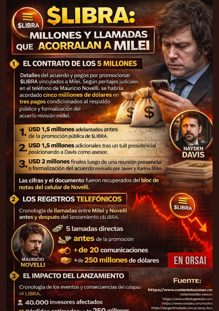 Peritajes judiciales revelan un contrato para promocionar la criptomoneda y reconstruyen comunicaciones directas entre el presidente y el trader Mauricio Novelli antes y después del lanzamiento del token. Un archivo recuperado del celular de Mauricio Novelli describe un acuerdo por cinco millones de dólares condicionado al respaldo público de Javier Milei a la criptomoneda $LIBRA. Al mismo tiempo, registros telefónicos muestran una cadena de llamadas entre el presidente, su entorno y el operador cripto en las horas clave del lanzamiento del token.
