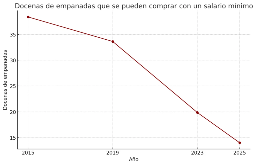 - Abril 2025: salario mínimo $308.200 / docena de empanadas $22.010,64 → 14 docenas