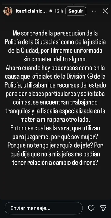 Ella, en cambio, fue apartada de sus funciones por filmarse con su uniforme. “Me sorprende la persecución de la Policía de la Ciudad así como de la justicia, por filmarme uniformada sin cometer delito alguno. Mientras los poderosos siguen tranquilos y la fiscalía mira para otro lado”, escribió en una historia que se propagó rápidamente por redes. Su mensaje expone lo que muchos agentes callan: adentro de la fuerza, la vara disciplinaria es política, selectiva, misógina y revanchista.
