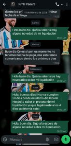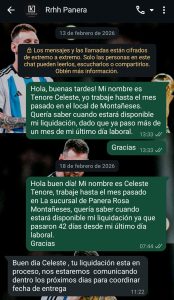 La publicación está respaldada por capturas de conversaciones de WhatsApp con el área de Recursos Humanos, donde puede verse con claridad el derrotero de reclamos de una ex empleada —Celeste Tenore— que trabajó en una sucursal de Panera Rosa y cuyo último día laboral ocurrió más de 50 días antes del último mensaje enviado.