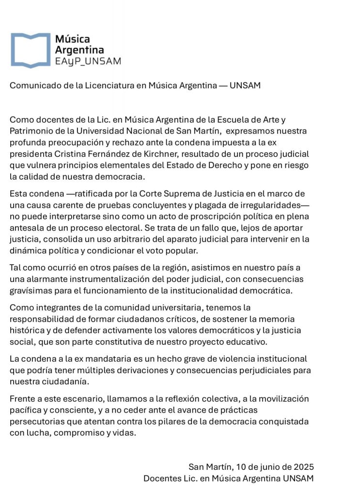 Docentes de la Licenciatura en Música Argentina de la Escuela de Arte y Patrimonio de la Universidad Nacional de San Martín (UNSAM) manifestaron su “profunda preocupación y rechazo” ante la condena ratificada por la Corte Suprema contra la ex presidenta Cristina Fernández de Kirchner. En un comunicado difundido este 10 de junio, señalaron que el fallo judicial “vulnera principios elementales del Estado de Derecho” y constituye un acto de proscripción política en plena antesala electoral.