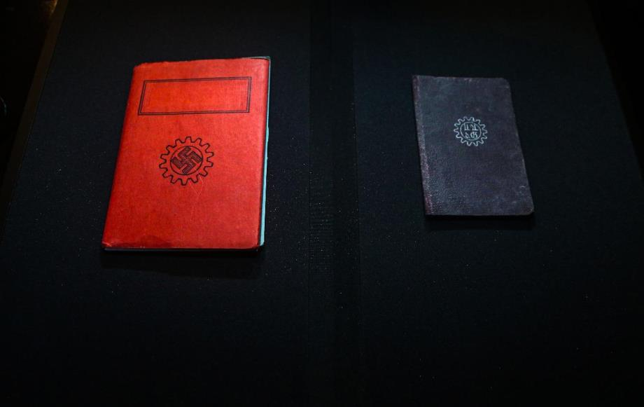 Libretas de afiliación con símbolos nazis encontradas dentro de las cajas.